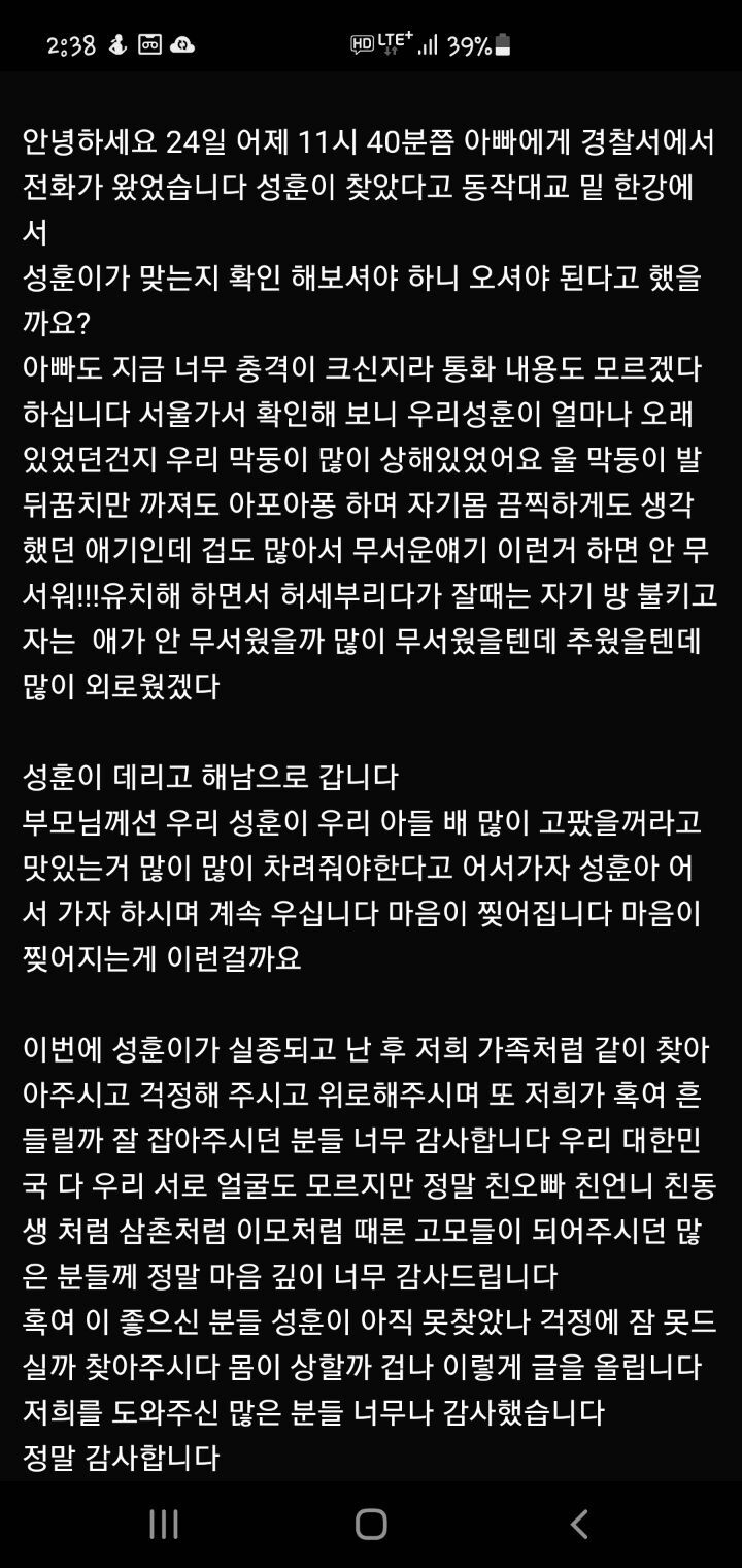 [스크랩] [눈물한방울]처남이 실종 됐어요 찾았어요 우리 막둥이 장례식해요(수정) 작성자되로 주고 말보로 받는다|작성시간21.03.25|조회수37,660 목록 댓글 388 글자크기 작게가 글자크기 크게가 너무 감사합니다 우리 성훈아 결혼식이 아닌 장례식을 치루는 구나해남가서 어서 맛있는 밥 많이 차려줄게 다음검색 스크랩 원문 : 쭉빵카페 현재 게시글 추가 기능 열기 북마크 공유하기 신고 센터로 신고 댓글 댓글 388 댓글쓰기 답글쓰기 댓글 리스트 작성자노을지는보리밭 | 작성시간 21.03.27 삼가 고인의 명복을 빕니다 작성자간지러 시뷰럴 | 작성시간 21.03.27 삼가 고인의 명복을 빕니다..그곳에선 그냥 맘 편하게 지내시길.. 작성자요즘 난 이래 | 작성시간 21.03.27 삼가 고인의 명복을 빕니다 작성자흠냐링꽁냐링 | 작성시간 21.03.27 삼가 고인의 명복을 빕니다 작성자로로로러어로 | 작성시간 22.04.20 삼가 고인의 명복을 빕니다 댓글 전체보기