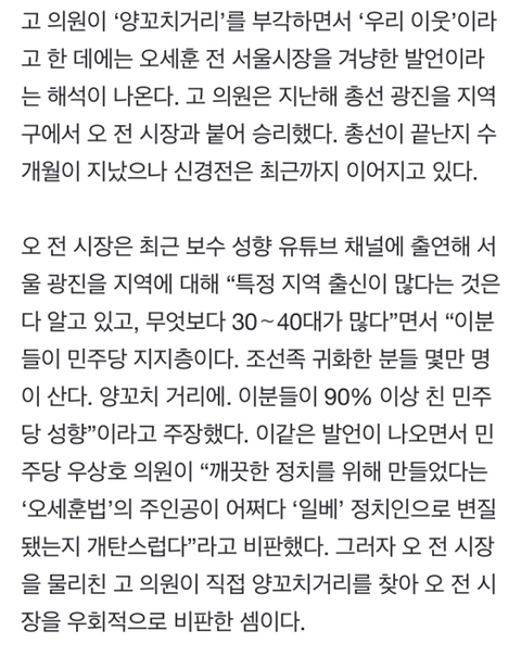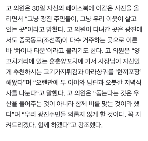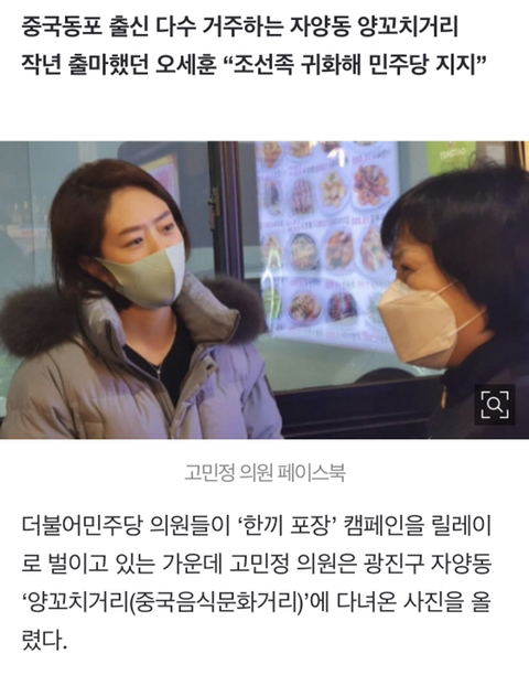 [스크랩] [여시뉴스데스크]'조선족' 발언 논란 오세훈 보란듯 '양꼬치거리' 간 고민정 "우리 이웃이 사는 곳" 작성자카레핏쨔|작성시간21.03.29|조회수2,264 목록 댓글 32 글자크기 작게가 글자크기 크게가 출처 : 여성시대 방광염질염조진다전문: https://n.news.naver.com/article/022/0003547819'조선족' 발언 논란 오세훈 보란듯 '양꼬치거리' 간 고민정 "우리 이웃이 사는 곳"중국동포 출신 다수 거주하는 자양동 양꼬치거리 작년 출마했던 오세훈 “조선족 귀화해 민주당 지지” 고민정 의원 페이스북 더불어민주당 의원들이 ‘한끼 포장’ 캠페인을 릴레이로 벌이고n.news.naver.com문제시 수정 다음검색 스크랩 원문 : *여성시대* 차분한 20대들의 알흠다운 공간 현재 게시글 추가 기능 열기 북마크 공유하기 신고 센터로 신고 댓글 댓글 32 댓글쓰기 답글쓰기 댓글 리스트 작성자김치처돌이 | 작성시간 21.03.29 아 짜증나 시발 으... 잘돌아간다.. 작성자Weeds | 작성시간 21.03.29 이웃이요? ㅋㅋ 작성자해리홍 | 작성시간 21.03.29 이웃????? 작성자시나몬스터 | 작성시간 21.03.29 진짜 대박이다ㅋㅋㅋㅋㅋ 작성자헐ㄹㄹㄹㄹ | 작성시간 21.03.30 국내에서 중국인 눈치보는거 자체가 문제야 댓글 전체보기