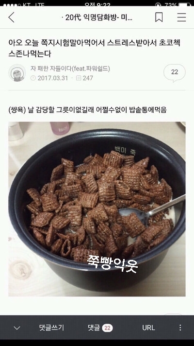 [스크랩] [배꼽의행방][익웃] 쪽지시험 말아먹고 스트레스 받아서 초코첵스 존나 먹는다 작성자소중한주말|작성시간21.04.02|조회수11,406 목록 댓글 11 글자크기 작게가 글자크기 크게가 ㅡ 다음검색 스크랩 원문 : 쭉빵카페 현재 게시글 추가 기능 열기 북마크 공유하기 신고 센터로 신고 댓글 댓글 11 댓글쓰기 답글쓰기 댓글 리스트 작성자노답중국 | 작성시간 21.04.02 ㅋㅋㅋㅋ밥통 ㅠㅠ 작성자별을칠수있다 | 작성시간 21.04.02 닉 무슨뜻이야?? 나도웃을래!!!! 답댓글 작성자여은솔 | 작성시간 21.04.02 https://m.cafe.daum.net/subdued20club/ReHf/1684212?svc=cafeapp 작성자여은솔 | 작성시간 21.04.02 닉넴ㅋㅋㅋㅋㅋㅋ 작성자뿌링클쿵야 | 작성시간 21.04.03 ㅋㅋㅋㅋㅋㅋㅋ 댓글 전체보기