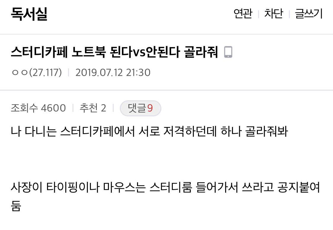 작성자고기고기빔 작성시간 21.10.23 아니 그루면 조용히 있는데 가면 되지 독방같은데.. 본문보니 노트북존 없는거같은데 타이핑 금지 아닌이상 자기가 피해야 됨