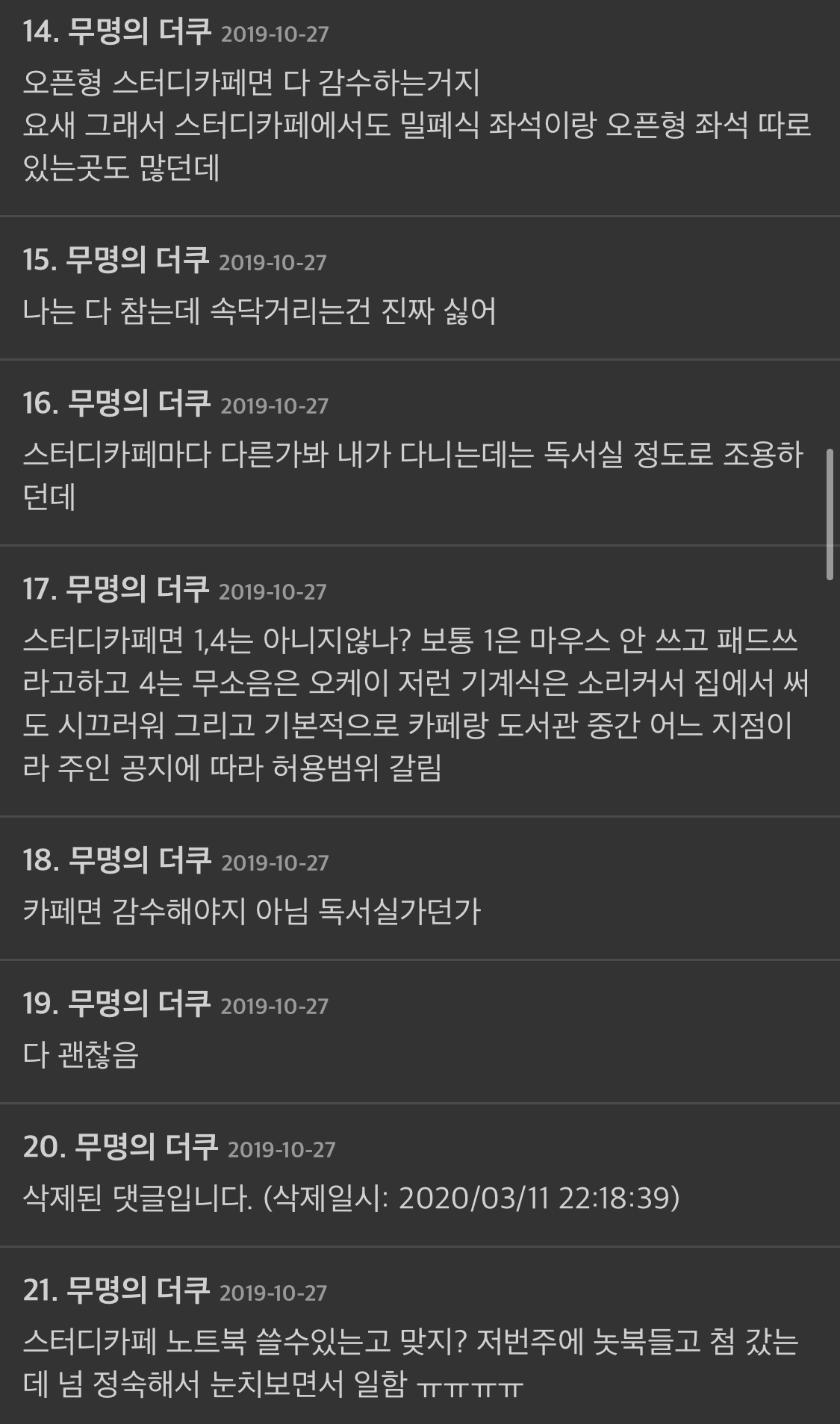 작성자짜파개띠 작성시간 21.04.03 스카마다 다르지.. 완전 조용한대는 좀 독서실 개념?