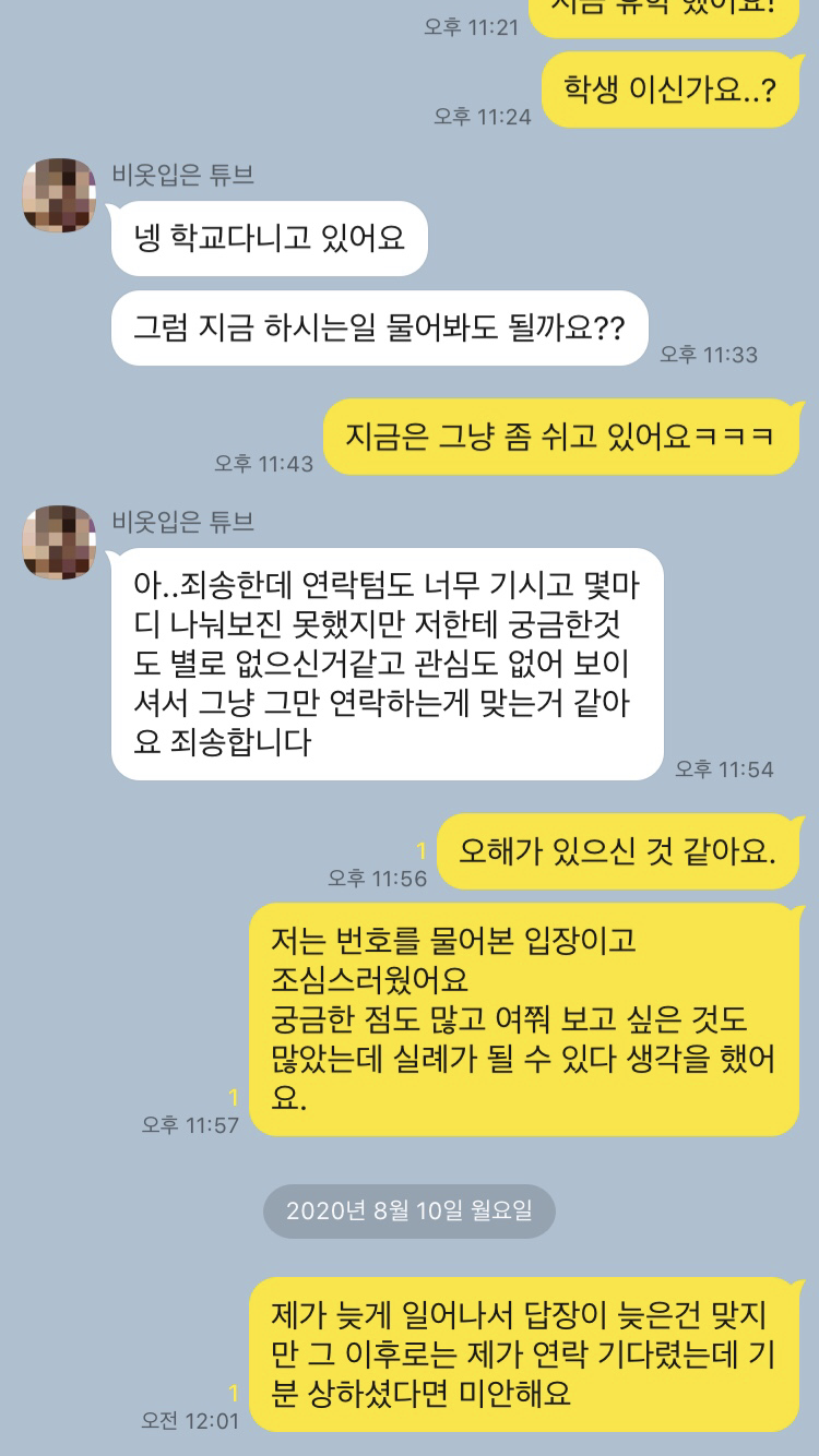 작성자뚱냥이즈 작성시간 21.04.03 저거 내가 당해봐서 아는데 내가 톡보내고 10분 뒤에 답장하는거 졸라 빡침