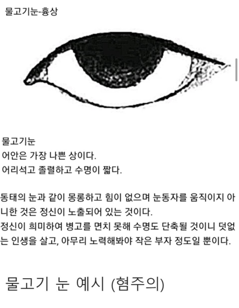 작성자괜찮아지겠지 안괜찮아도 뭐어쩌겠어 작성시간 21.04.04 삼백안이 문제가 아냐 당장 예시 눈깔만 봐도 삼백안은 별로 없음;;삼백안이든 아니든 동공 반쯤 덮고 눈빛이 흐리멍텅고 초점 없는 애들은 만나면 도망쳐야 할 상;;