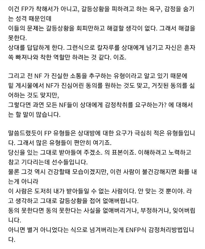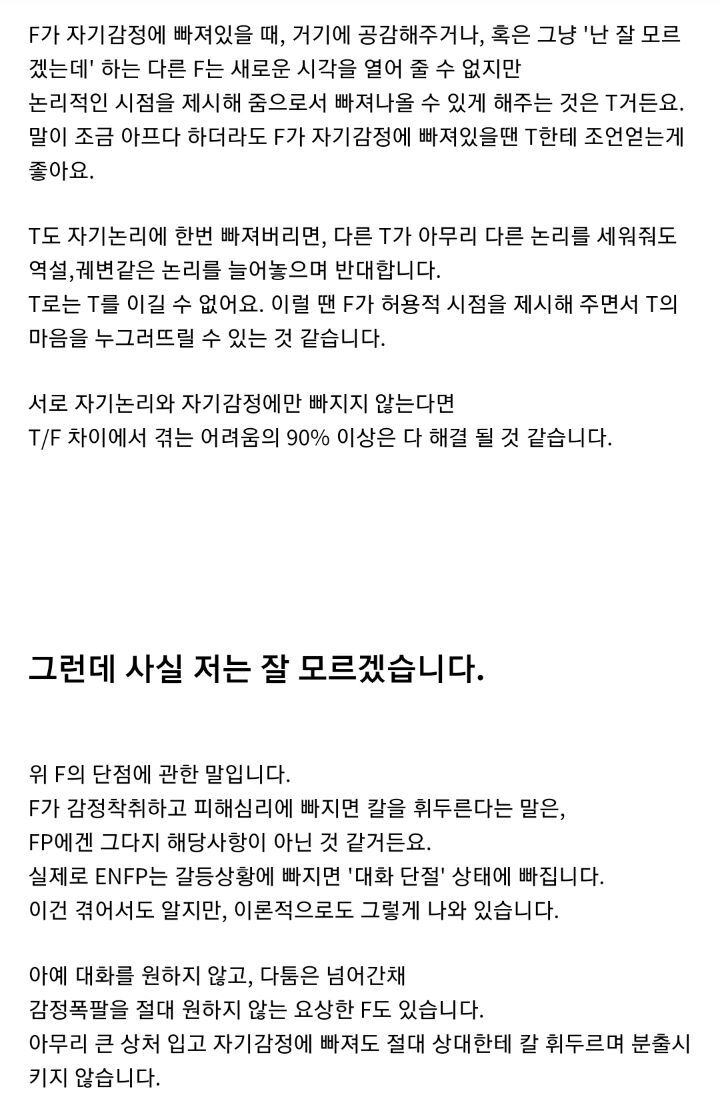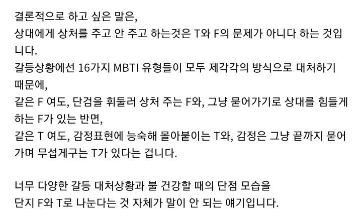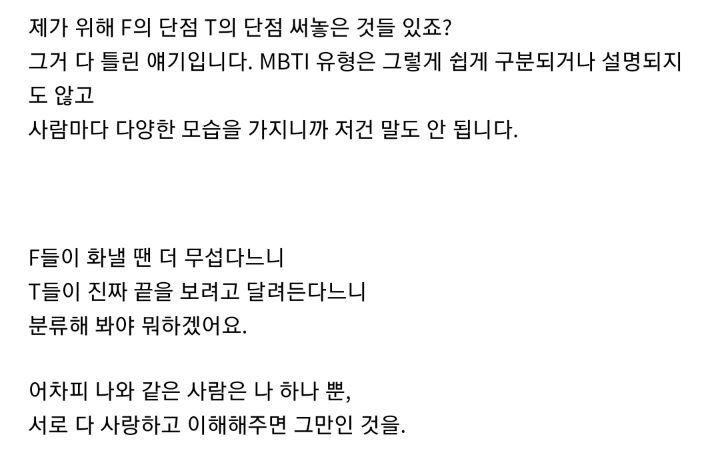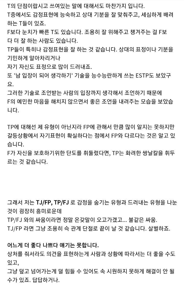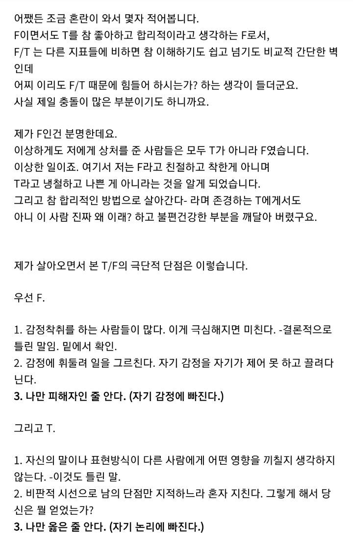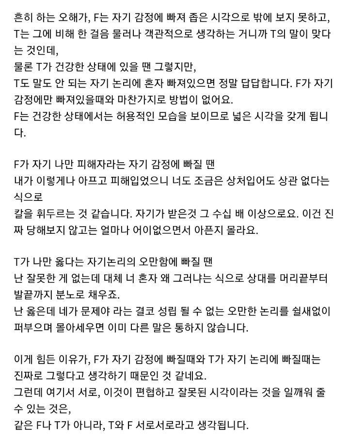 mbti를 통해 나를 돌아보고 상대를 이해할 수 있는 순기능이 있지만 오해가 생기는 것도 답답할 따름이었는데 이 글이 답답했던 부분을 명쾌하게 잘 설명해 준 거 같음. 그다지 부드럽지 않은 관계를 맺고 있는 사람들 중 F가 없었던 것은 아니지만, 그 거리감의 이유가 단지 T와 F라서는 아니었다고 생각함.