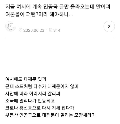 어떻게 소수 회원들이 커뮤 전반 여론을 통째로 흔드는지에 대한 글이야.