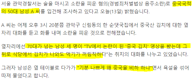 [여시뉴스데스크][단독] "중국 김치 걱정돼" 옆자리 손님 대화에 "무시하냐" 시비 작성자차분하게 돌아있는 장녀|작성시간21.04.13|조회수3,161 목록 댓글 27 글자크기 작게가 글자크기 크게가 출처 : https://news.v.daum.net/v/20210413154200187[단독] "중국 김치 걱정돼" 옆자리 손님 대화에 "무시하냐" 시비음식점 옆자리에서 중국산 김치에 대한 대화를 듣고 욕설과 고성을 지르며 행패를 부린 남성이 경찰에 붙잡혔습니다. 서울 관악경찰서는 술을 마시고 소란을 피운 혐의(경범죄처벌법상 음주소news.v.daum.net ----사실을 말했는데 비하라니..그럼 너네가 다 먹던가ㅜㅜ 다음검색 현재 게시글 추가 기능 열기 북마크 공유하기 신고 센터로 신고 댓글 댓글 27 댓글쓰기 답글쓰기 댓글 리스트 작성자돼지의꿈은멈추지않는다 | 작성시간 21.04.13 니네나라로 꺼져 제발 작성자다다음주 | 작성시간 21.04.13 또 지랄이네 작성자블레어월도프 | 작성시간 21.04.13 ㅋㅋㅋ그럼 느그나라 사람들한테 깨끗이 만들라고 하든가ㅋㅋㅋㅋ 작성자우리애기보고싶어 | 작성시간 21.04.13 짱개 고 홈 작성자천서진 | 작성시간 21.04.14 니나 알몸김치 쳐먹어ㅜ 댓글 전체보기