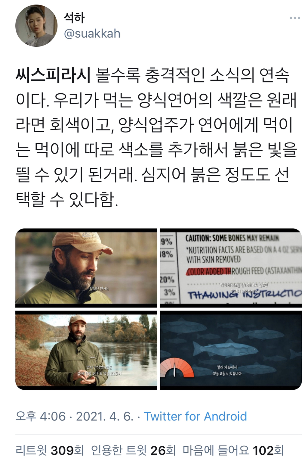 좁은 양식장에서 그저 바보같이 뱅뱅 돌며 키워지는 양식연어가 먹는 색소와 사료들은 무엇으로 만들어지며 그걸 섭취하는 인간에겐 아무 영향이 없을까? 병으로 폐사 되는 연어의 %가 상당히 높아 놀라워