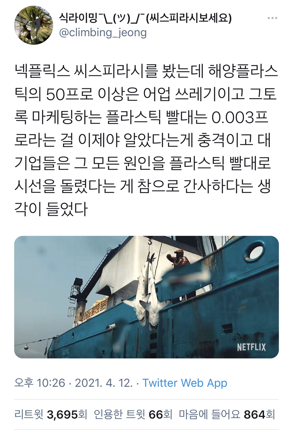 해양 생태계는 지금 플라스틱이 문제가 아니라 인간의 '지속 가능한 어업'이 제일 문제였음. 바다가 무너지면 육지가 무너지고 그 모든 행위 끝엔 결국 우리 인간이 있다라는 강렬한 메세지를 던지고 있어. 모두가 한 번씩 보고 환경에 대해 생각해 봤음 좋겠어!