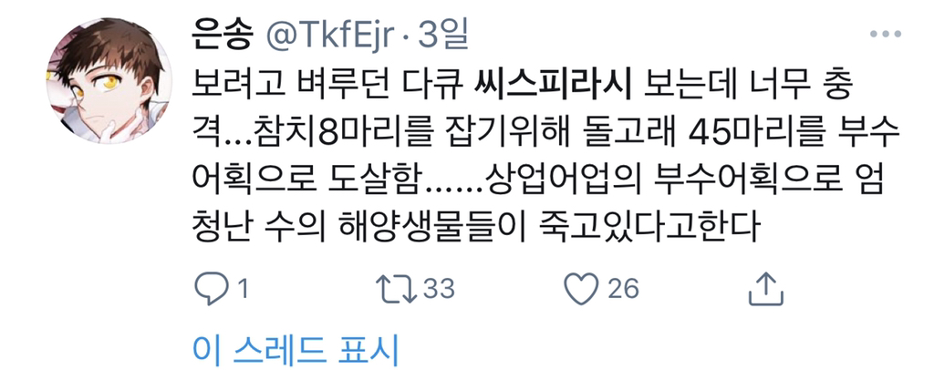 작성자밥드 작성시간 21.04.14 우리나라는 수산물 소비율 1위 국가야 우리나라는 원채 안먹는 부위가 없어. 살은 회로, 구이로 말려서도 먹고 뼈는 매운탕으로, 잔잔한 부수어획인 작은고기들은 젓갈류로. 심지어 알 벤 고기가 맛있다고 먹는가하면 생선알은 명란, 날치알 등으로 전부 다 소비하잖아.. 우리나라가 수산물은 참 좋아하는데 그만큼 수산물 소비하면서 인식이 아직도 낮은게 문젠거같아
