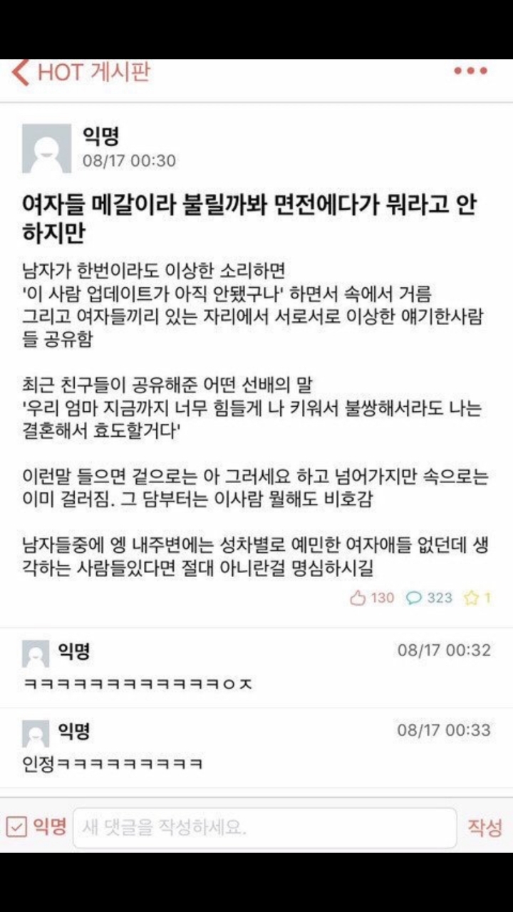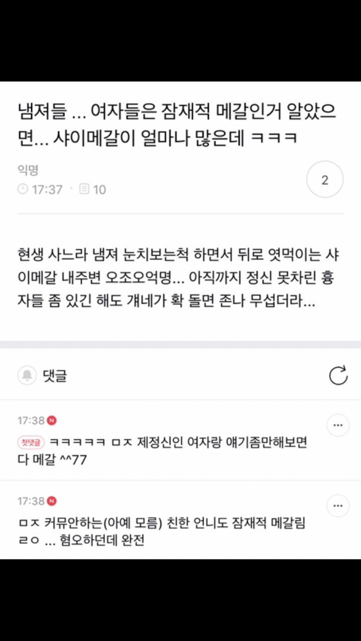 작성자ㅇl좃나게싸가지업는자식가 작성시간 21.04.24 우리 직장 동료도 커뮤 안하고 남친도 있고 교회 정말 착실히 다니면서 무해한 이미진데 남혐있음ㅋㅋㅋㅋㅋㅋㅋㅋㅋㅋㅋㅋㅋㅋㅋㅋㅋㅋ