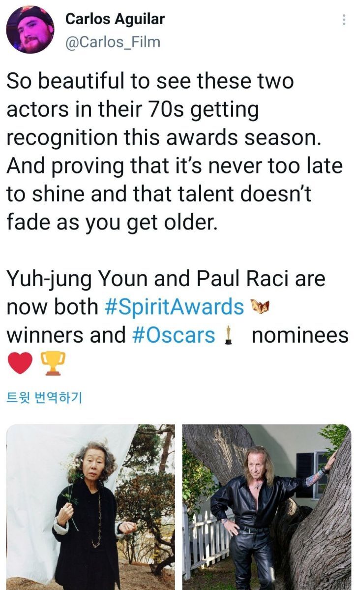 저명한 현지 비평가는 윤여정님과 더불어 인디펜던트 스피릿 어워드 수상한 것에 대해 70대가 늦은 나이가 아니라고 함