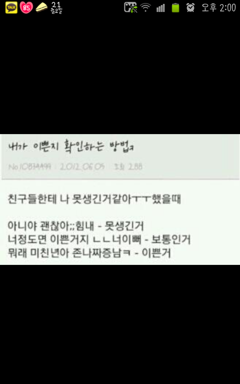 작성자자개지박령 작성시간 13.01.21 그것도 이써 내 대학친구가 말해준건데 "야. 못생긴 애." 했을 때 웅 하고 아무렇지도 않게 오는 애는 예쁜 애고 "야. 못생긴 애."했을 때 "ㅡㅡ?" 하는 애는 못생긴 애래. 근데 진짜 울 과에 자기 진짜 이쁜맛에 사는 못생긴 애 있거든??????????? 근데 걔 "ㅡㅡ?"했음. 암턴 그러하다고 한다.
