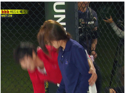 잘 걸어가던 지효 머리꽁지 잡아당김