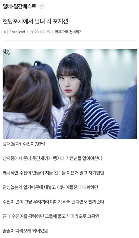 그리고 헌팅할 때 한남들 기준에서 못생기거나 “기가 쎈”여성을 수진이로 칭하며 계속해서 밈으로 쓰고 있음^^