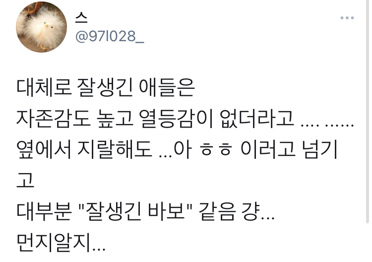 작성자니꼬맨똥 작성시간 21.05.02 맞아 내 지인중에 얼굴 개작고 키크고 운동 좋아해서 몸좋은데 샤이니 민호같이 생긴애 있음. 얘네 집안은 막 부자는 아녀도 중산층 정도 되고 대신 얘가 공부를 개 잘해서 외고 나와서 좋은 대학 나온 애 있는데 내가 아는 남자 중에 유일하게 자기객관화 오지는 애임. 지가 잘못하면 각잡고 사과하는 애. 열등감없고 뭐만 하면 맨날 헤헤 거려서 별명 병신이였음ㅋㅋㅋㅋ 지한테 욕해도 헤헤 거림ㅋㅋ 저새낀 잘생겼는데 왜 병신이지? 이런 얘기 많이 듣는 애 있음ㅋㅋㅋ