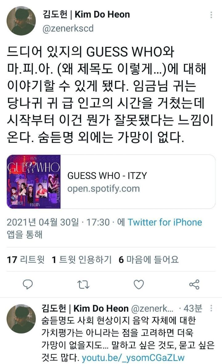 작성자푸룬주스 작성시간 21.05.03 가사는 워낙 이상한거 많았으니까 괜찮다고 생각하는데 곡이... 박진영 감이 이랬나; 싶을 정도의 퀄로 뽑아놓음ㅠ