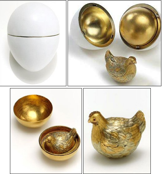 파베르제의 첫번째 달걀은 금으로 세공되었고 이 황금암탉은 황손과 제국을 품은 어머니로 황후를 표현한 것이라고 함