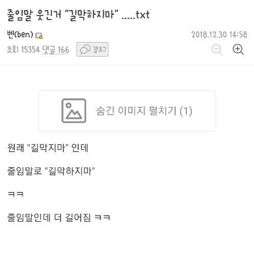 [스크랩] [흥미돋]줄임말 웃긴거 "길막하지마" 작성자소중한주말|작성시간21.05.02|조회수8,601 목록 댓글 15 글자크기 작게가 글자크기 크게가 출처 : https://theqoo.net/1809116805 다음검색 스크랩 원문 : *여성시대* 차분한 20대들의 알흠다운 공간 현재 게시글 추가 기능 열기 북마크 공유하기 신고 센터로 신고 댓글 댓글 15 댓글쓰기 답글쓰기 댓글 리스트 작성자비밀로간직해줄게 | 작성시간 21.05.02 ㅋㅋㅋㅋㅋㅋㅋㅋ하지만 길막지 마 보다 길막하지 마가 더 찰떡이라구요 작성자낑깡라떼 | 작성시간 21.05.02 길막노! 작성자든든함에미소가사르르 | 작성시간 21.05.02 ㅋㅋㅋ나는 길막좀;; 이랫는뎈ㅋㅋ 이제는 귀찮아서.. 빵빵 한다.... 작성자증명사진찍은고영 | 작성시간 21.05.03 길막ㄴㄴ 작성자귤라방스 | 작성시간 21.05.03 맞네... 댓글 전체보기