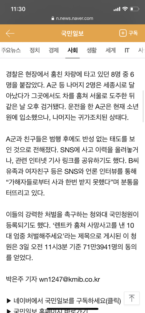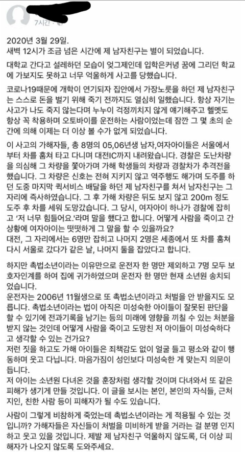- 10대 렌트카훔쳐 도주 중 오토바이 운전자 사망사고 엄중처벌촉구 청원