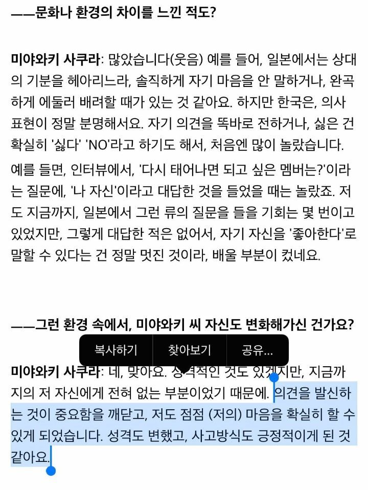얼마전에 했던 일본 아이돌 출신 미야와키 사쿠라의 인터뷰 중 발췌함.