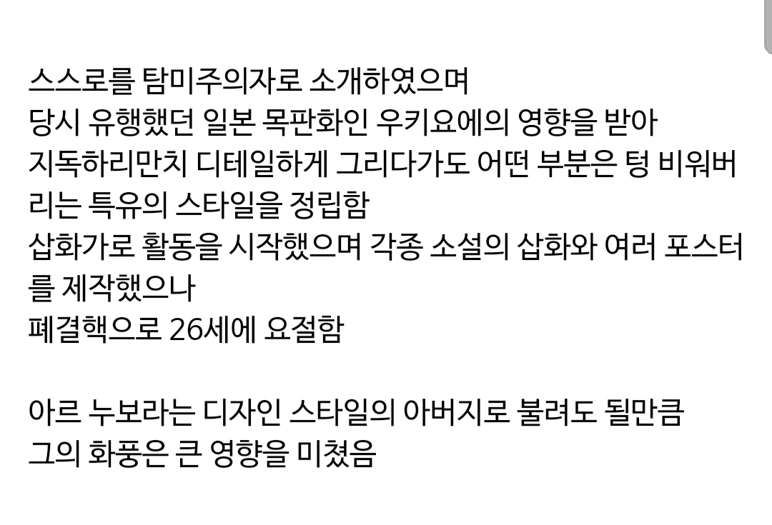 [흥미돋]퇴폐, 탐미, 관능, 집착, 공포의 화가 오브리 비어즐리.jpg 작성자겟백|작성시간21.05.14|조회수7,802 목록 댓글 5 글자크기 작게가 글자크기 크게가 출처 : 여성시대 겟백 다음검색 현재 게시글 추가 기능 열기 북마크 공유하기 신고 센터로 신고 댓글 댓글 5 댓글쓰기 답글쓰기 댓글 리스트 작성자부이옹 | 작성시간 21.05.14 이사람 전시 갔었는데 넘 좋았어!!! 작성자양키고홈 | 작성시간 21.05.14 저런건 뭘로 그리는겨? 작성자신입사원 죠르디 | 작성시간 21.05.14 와진심 살짝 동양느낌나네했는데 이게웬걸 ㄹㅇ 우키요에에 영감받은거네 작성자둥냥둥냥 | 작성시간 21.05.14 오 신기해 작성자식물짱조아 | 작성시간 21.05.16 오...멋지다 글 고마워! 댓글 전체보기