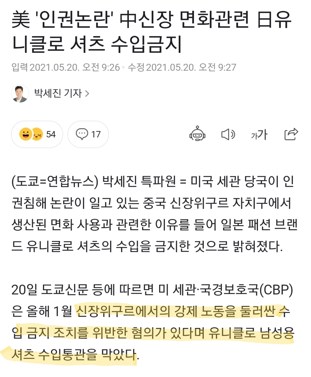 유니클로에서 강제노동과 수용소로 문제되는 짱꼴라 신장 위구르에서 수입한 목화를 사용해서 옷을 만든다고 하네..