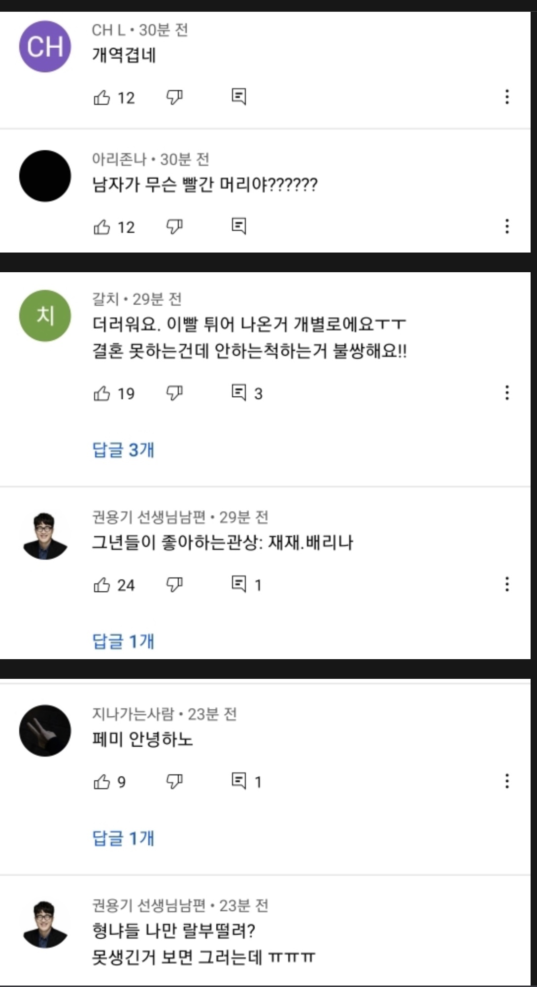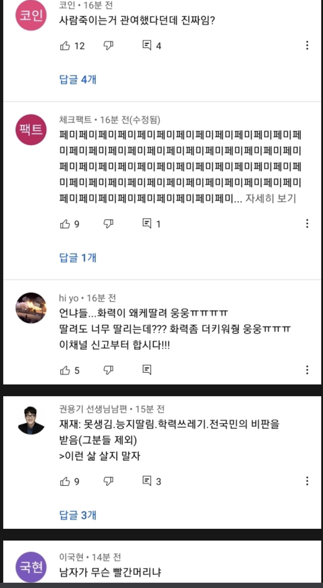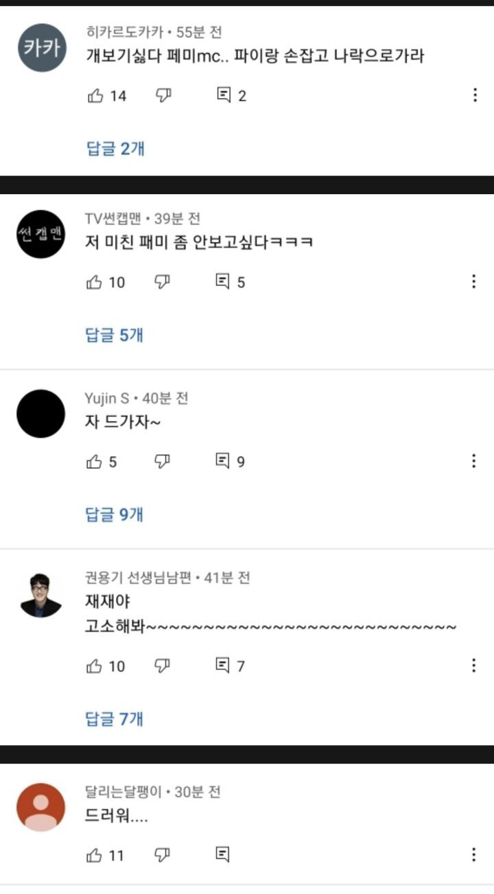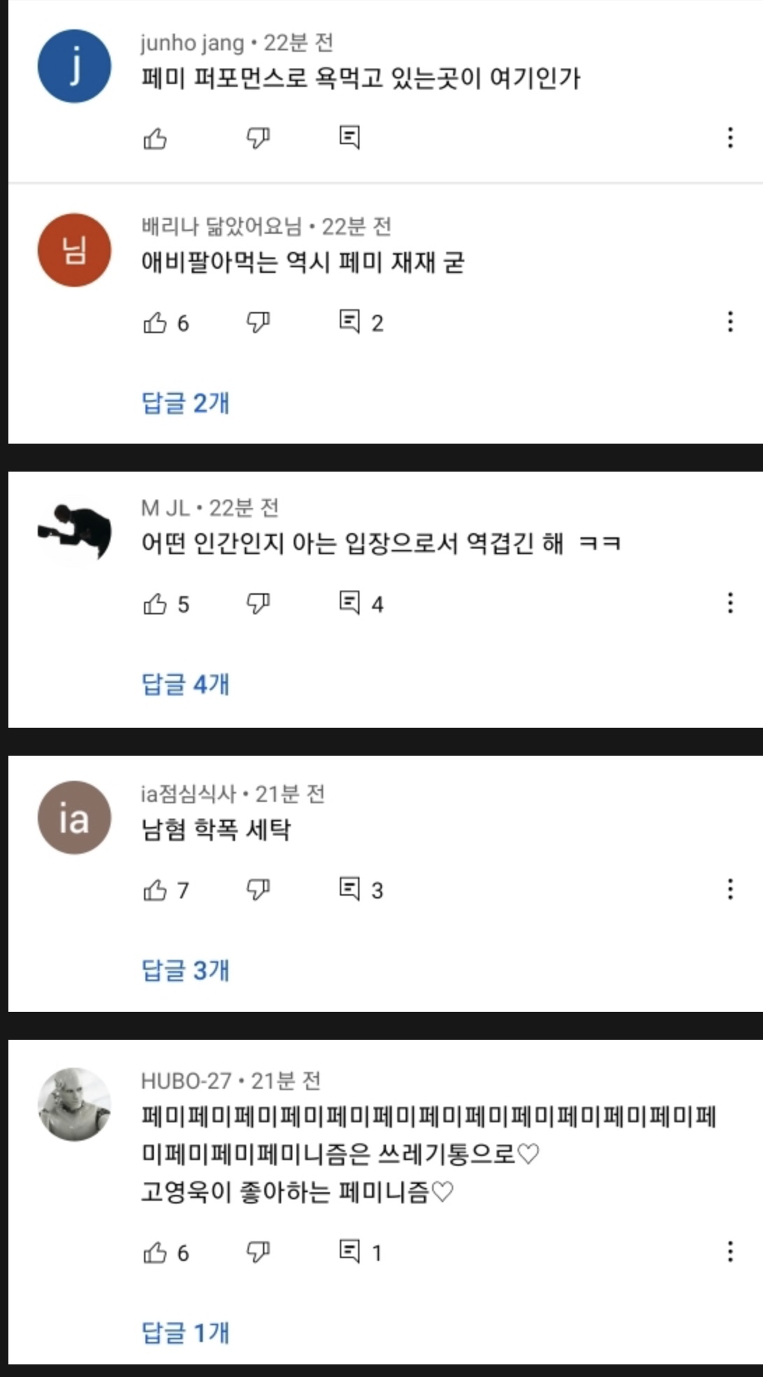 [기타]현재 문명특급 최신 댓글 상황 (심각함) 작성자김여명노래개좋음|작성시간21.05.22|조회수43,604 목록 댓글 246 글자크기 작게가 글자크기 크게가 출처 : 여성시대 해뷰해뷰 (원출처 신생카페라 허락맡고 퍼옴) 🔥🔥이렇게 된 이유 : ^뻑가^라는 유튜버가 또 저격영상 올림캡쳐하다가 제 3자인 나도 못볼만큼 많아서 그만둠선플+신고 부탁해!!!! 다음검색 현재 게시글 추가 기능 열기 북마크 공유하기 신고 센터로 신고 댓글 댓글 246 댓글쓰기 답글쓰기 댓글 리스트 작성자파송송 | 작성시간 21.05.23 왜저래 작성자이직원해원츄 | 작성시간 21.05.23 열등감에 찌들어 사는듯 작성자Kohyo | 작성시간 21.05.23 시바 욕나오네 작성자결혼식하객룩 | 작성시간 21.05.23 재재가 뭔 잘못했단 말임..? 성매매하는 한남 욕이나 하러 갈 것이지 어딜? 작성자초록 나무 | 작성시간 21.05.24 왜저래 페미 페자도 모르는 놈들이 댓글 전체보기