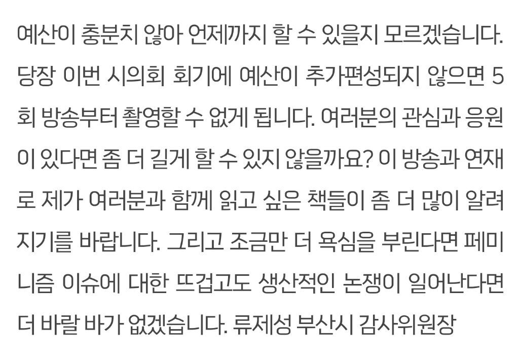 위원장님피셜 .... 예산이 추가편성되지 않으면 5회부터 촬영이 안된대!!!!
