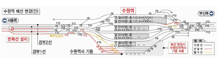 특히 수원역의 경우 정거장 인근에 KTX 열차 반복선과 주박선을 신설하며 승강장 구조도 변경할 계획이다. 이와 함께 서정리역과 지제역은 열차가 정차하지 않지만 연결선과 접속되는 것을 대비해 신규선로가 건설된다.