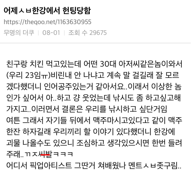 [배꼽의행방]어제 ㅅㅂ 한강에서 헌팅당함 작성자딱대|작성시간21.05.24|조회수19,822 목록 댓글 44 글자크기 작게가 글자크기 크게가 출처 : 여성시대 (본인 닉네임) 다음검색 현재 게시글 추가 기능 열기 북마크 공유하기 신고 센터로 신고 댓글 댓글 44 댓글쓰기 답글쓰기 댓글 리스트 작성자김순옥 | 작성시간 21.05.24 저걸...센스있는 멘트라고 치는게 충격이다 작성자문학과 지성사 | 작성시간 21.05.24 재기하자 작성자불나방주시 | 작성시간 21.05.24 웩 작성자꼭장군 | 작성시간 21.05.24 검지중지 쫙펼쳐 눈찔러뿌려 작성자노는거아님 여시로영어공부하는중 | 작성시간 21.05.24 비린내... 비린내.. 댓글 전체보기