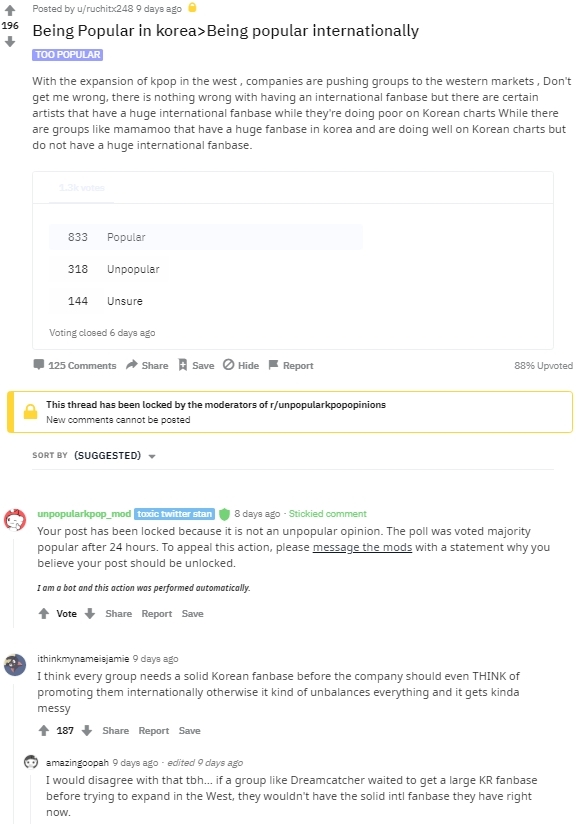 여기에서는 하위 레딧으로 인기가 있지만, 단지 특정 그룹이 해외에서는 인기가 없다는 이유만으로 대부분의 팬들이 그룹을 무시해서 인기가 없지.
