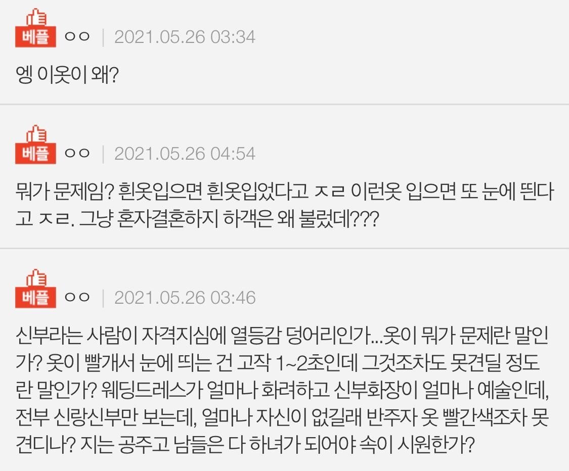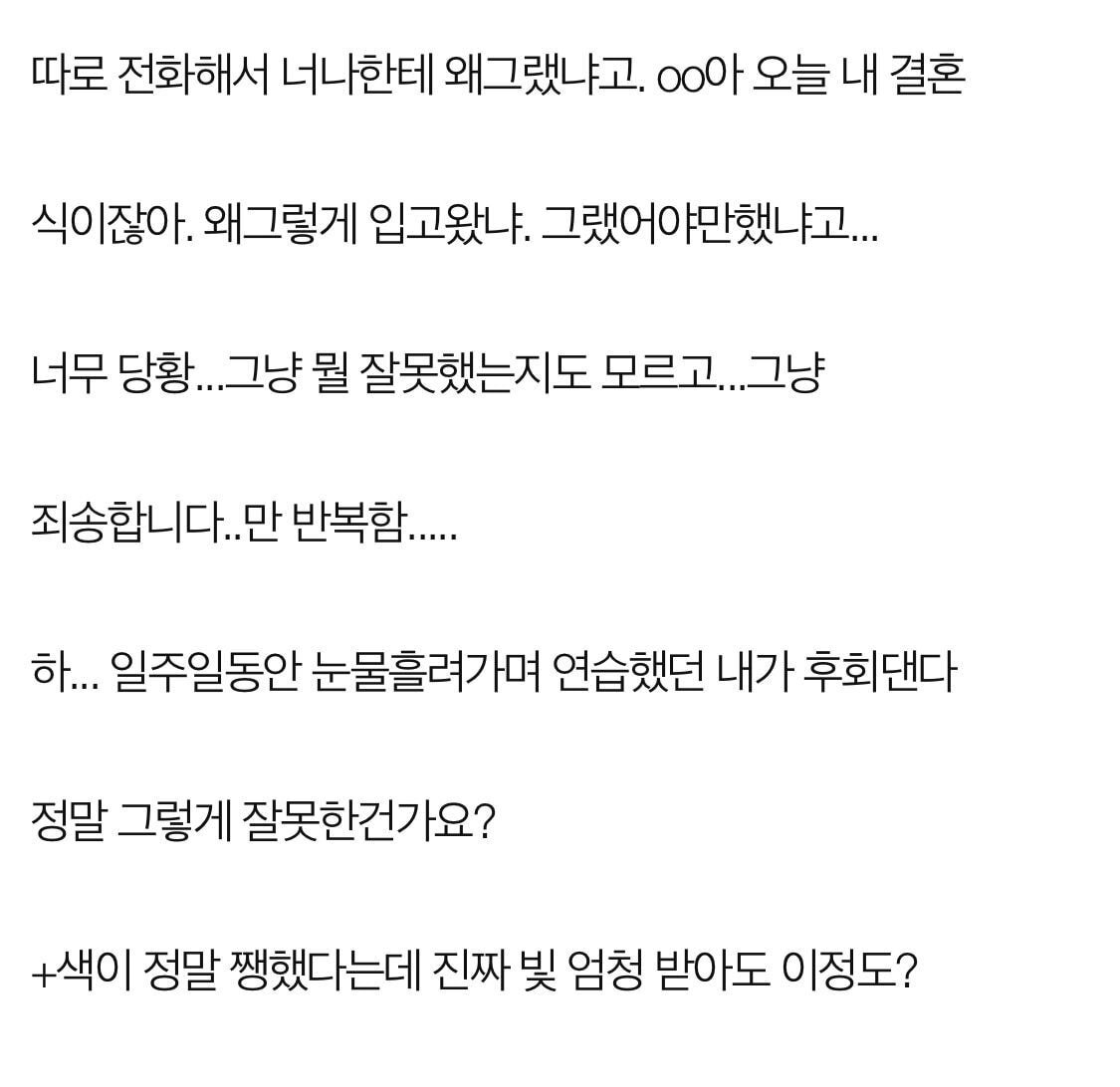 작성자얼그레이커피 작성시간 21.05.26 장례식도 아니고 결혼식에서 컬러감있는 옷 문제 안되는데...? 뭐가문제지..?