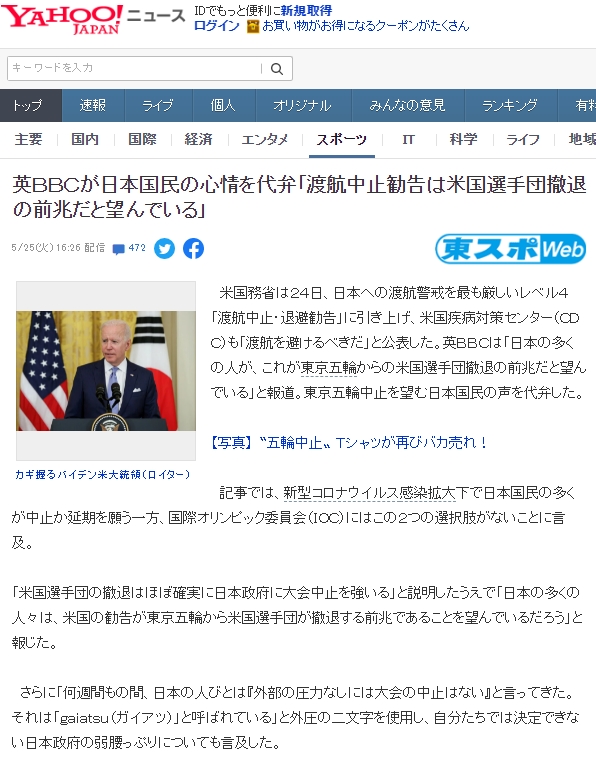영국 BBC가 일본 국민의 심정을 대변 "도항 중지 권고는 미국 선수단 철수의 전조라고 바라고 있다"