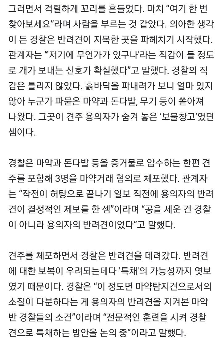 [여시뉴스데스크]“여기 마약있어요”…주인 ‘배신’한 반려견, 경찰견 특채 기회 작성자와이스피|작성시간21.05.26|조회수62,710 목록 댓글 37 글자크기 작게가 글자크기 크게가 출처 : https://n.news.naver.com/article/081/0003189205 다음검색 현재 게시글 추가 기능 열기 북마크 공유하기 신고 센터로 신고 댓글 댓글 37 댓글쓰기 답글쓰기 댓글 리스트 작성자아콰맨 | 작성시간 21.05.26 똑똑정의강쥐!! 작성자다잘될거라믿는다 | 작성시간 21.05.26 보복이 우려되어서 데려간 거 넘 다행 ㅜㅜㅜㅜㅜ 작성자마늘 바게트 | 작성시간 21.05.26 헐 ㅋㅋㅋㅋㅋ댕똑똑 작성자클리포드 앤더슨 | 작성시간 21.05.27 귀여워ㅜㅜㅜㅜㅜㅜ 작성자Younggods | 작성시간 21.05.27 행복하게 살아라!!!! 댓글 전체보기