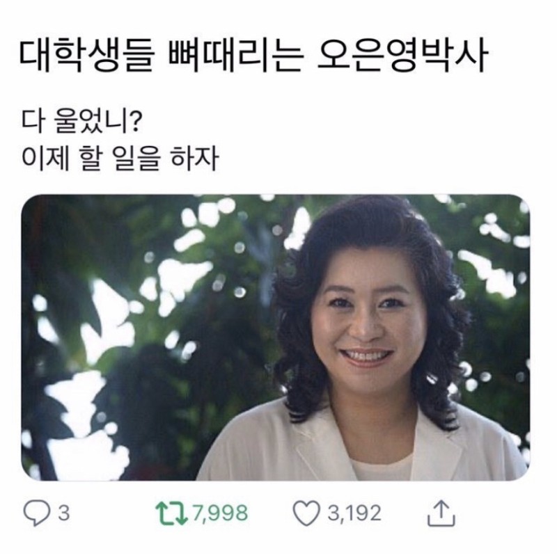 [흥미돋]대학생 뼈때리는 오은영 박사님 작성자Benjamin|작성시간21.06.11|조회수7,828 목록 댓글 2 글자크기 작게가 글자크기 크게가 출처 : 여성시대 Benjamin 네.... 다음검색 현재 게시글 추가 기능 열기 북마크 공유하기 신고 센터로 신고 댓글 댓글 2 댓글쓰기 답글쓰기 댓글 리스트 작성자셤기간공부하기싫어 | 작성시간 21.06.11 ...셤끝나자마자 도서관옴.... 수요일 3과목 본다 씨발 ㅠㅠ 의욕재기했어.. 작성자R=VD 올해는내맘대로 | 작성시간 21.06.11 오늘 종강했어용 ^^♡ 댓글 전체보기