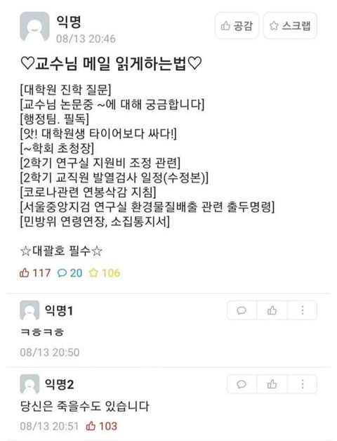 작성자그림자 없는 작성시간 21.06.14 와 어그로 장인 ㅠㅠㅋㅋㅋㅋㅋㅋ 교수 아닌데도 다 눌러보고싶어 꼭 읽어야할거같아 안읽으면 불이익 생길거같아