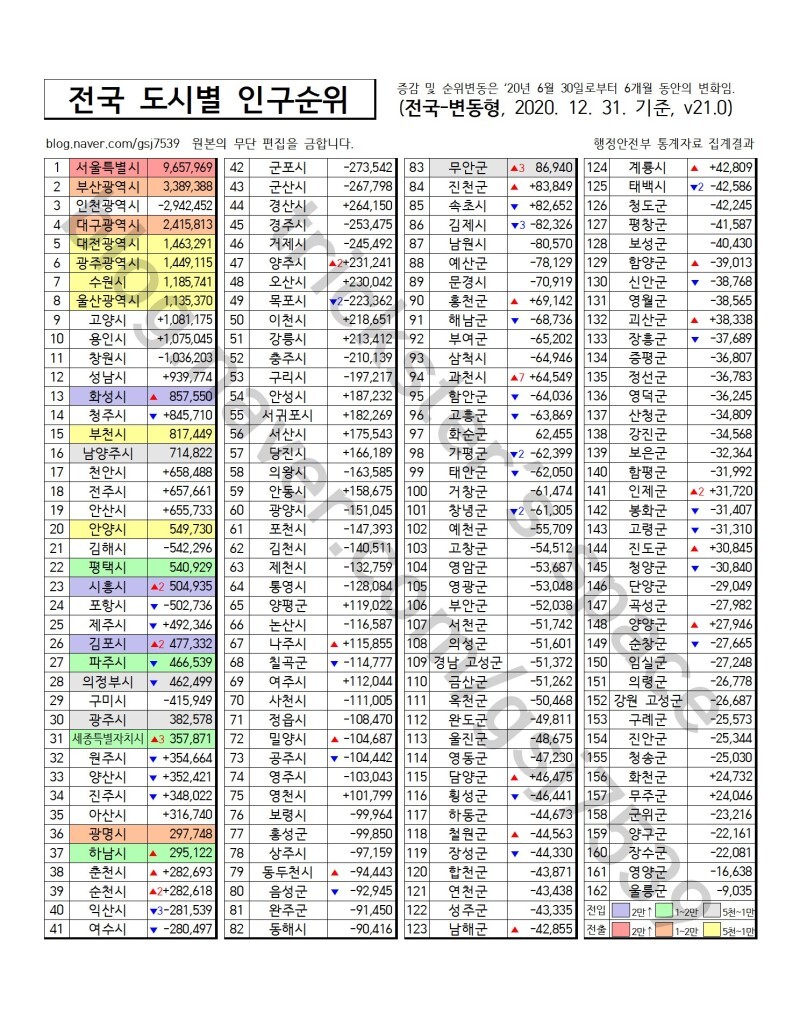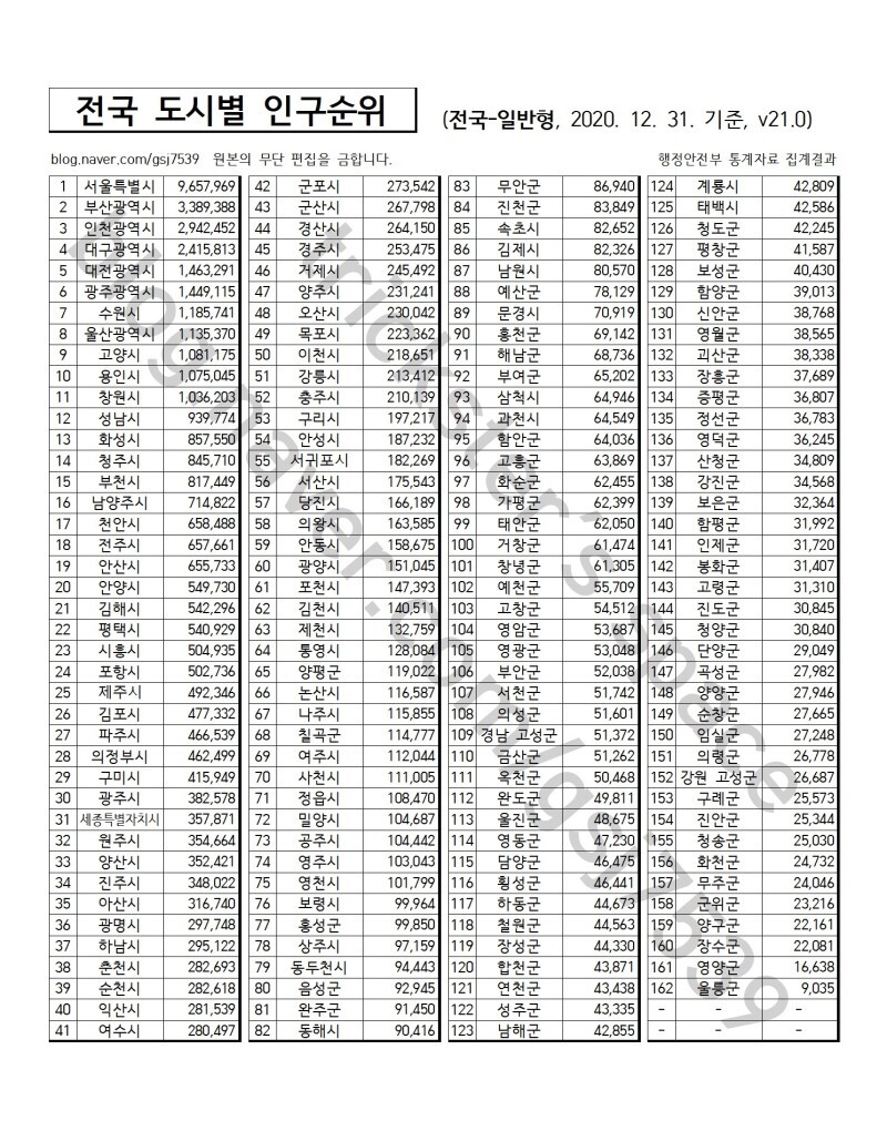 [스크랩] [흥미돋]한국 도시별 인구 순위(2021).jpg 작성자송도국제도시|작성시간21.06.14|조회수3,185 목록 댓글 11 글자크기 작게가 글자크기 크게가 출처 : https://m.blog.naver.com/gsj7539/222241127379 2차 : 우리동네목욕탕1. 서울2. 부산3. 인천4. 대구5. 대전6. 광주7. 수원8. 울산9. 고양10. 용인밑은 인구수 변동 표시📍특징화성시는 몇년째 폭발적 인구 전입이 이뤄지고 있음특별시, 광역시 사이에 껴있는 수원시의 위엄 다음검색 스크랩 원문 : *여성시대* 차분한 20대들의 알흠다운 공간 현재 게시글 추가 기능 열기 북마크 공유하기 신고 센터로 신고 댓글 댓글 11 댓글쓰기 답글쓰기 댓글 리스트 작성자mental health nurse | 작성시간 21.06.14 창원인구 한명빼야함ㅠ 호메 대전으로 주소이전함ㅠㅠ 답댓글 작성자황윤석 주민규 | 작성시간 21.06.14 여시 댓글 왤케 귀엽지 ㅋㅋㅋㅋㅋㅋㅋㅋ 작성자53.양석환 | 작성시간 21.06.14 부천 이 쥐똥만한 곳에 80만이나 사니까 어딜가든 사람 미어터지지ㅜ 작성자군침ㅇl 싹도노 | 작성시간 21.06.14 수원 면적에비에 사람 진짜 개많어.... 작성자유꼼 | 작성시간 21.06.14 수원 영통 살기 너무 좋아ㅠㅠㅠ 댓글 전체보기
