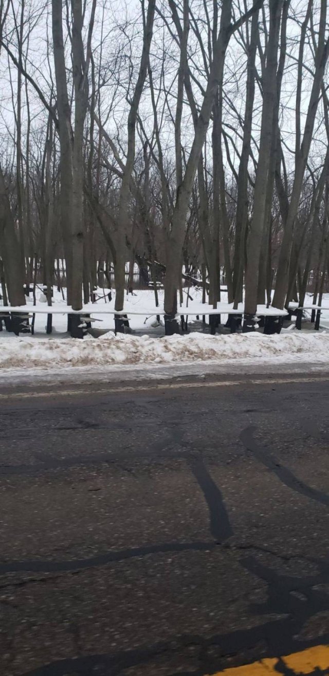A : 강의 범람 때문입니다. 물은 위쪽부터 얼기 때문에 물이 빠지면서 얼음이 남게 되고 그 위에 눈이 쌓인 것 입니다.