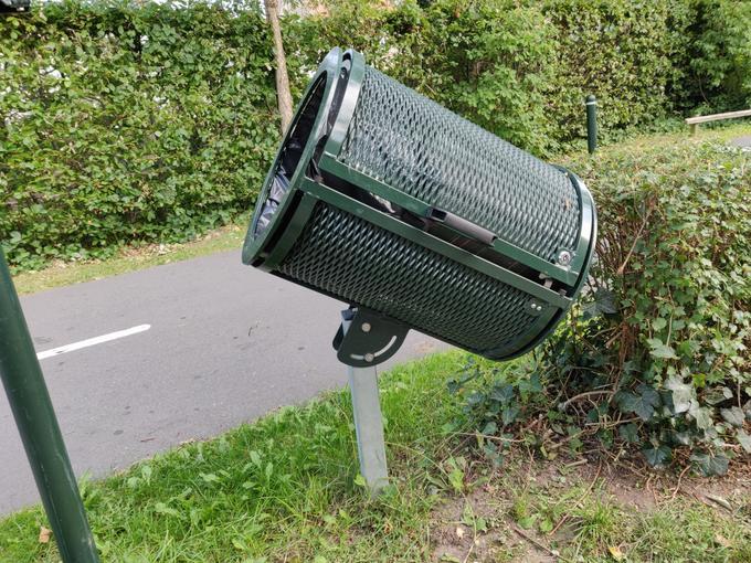 A : 자전거용 쓰레기통입니다. 자전거를 타고 가는 사람들이 버리기 쉽게 하기 위해서 기울어져 있습니다.