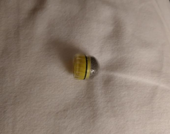 A : FN303발사기 용 탄약중 하나입니다. 살상력이 적고 납 대신 무독성의 비스무트를 사용합니다. 해당 모델은 지워지지 않는 착색제가 들어있습니다. 가져도 됩니다. 상관 없는 얘기지만, 비스무트는 기술적으로 방사능이 있습니다. 하지만 반감기가 너무나 길어서 실제적으로 방사선이 방출 되지는 않으므로 안전합니다.