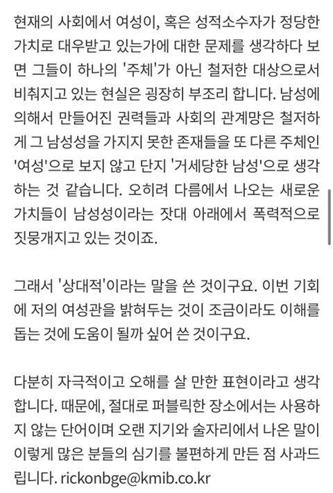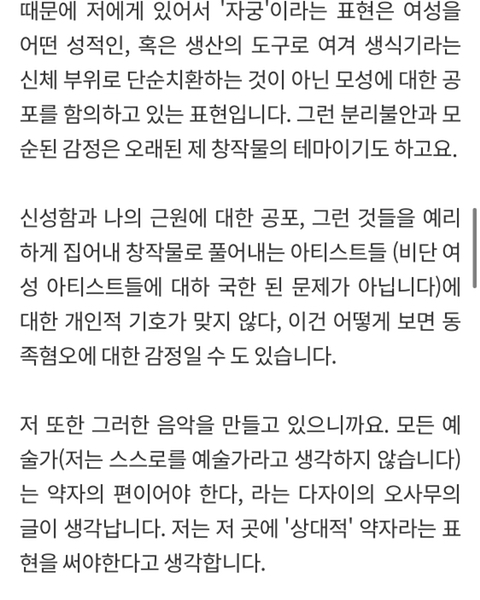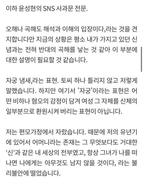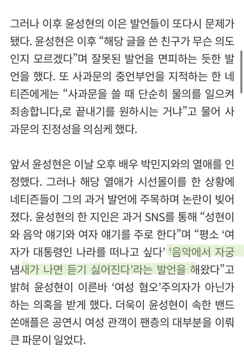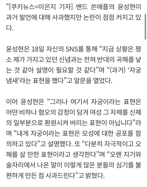 [여시뉴스데스크]쏜애플 윤성현, ‘자궁 냄새’ 발언 사과 직후 발언 면피 논란 “어떤 의도로 썼는지” 작성자위장아힘을내|작성시간21.06.21|조회수10,735 목록 댓글 38 글자크기 작게가 글자크기 크게가 출처 : http://www.kukinews.com/newsView/kuk201603190023#_DYAD쏜애플 윤성현, ‘자궁 냄새’ 발언 사과 직후 발언 면피 논란 “어떤 의도로 썼는지” www.kukinews.com 다음검색 현재 게시글 추가 기능 열기 북마크 공유하기 신고 센터로 신고 댓글 댓글 38 댓글쓰기 답글쓰기 댓글 리스트 작성자무케야 크앙해봐 | 작성시간 21.06.21 미친새끼네... 삭제된 댓글입니다. 답댓글 작성자퇴사를 꿈꾸는 나 | 작성시간 21.06.21 22 이거 알자마자 노래 싹 플레이리스트에서 지웠는데 아직도 여자팬 개많더라; 작성자퐁푱 | 작성시간 22.06.03 지랄을ㅋㅋㅋㅋㅋㅋㅋㅋㅋㅋㅋㅋㅋㅋㅋ 작성자고호로모 | 작성시간 23.08.11 이야 ㅋㅋㅋㅋㅋㅋㅋ 그럴싸한 말로 결국 기존 가부장제 속의 여성성을 지지한다는 말을 하네^^ 댓글 전체보기