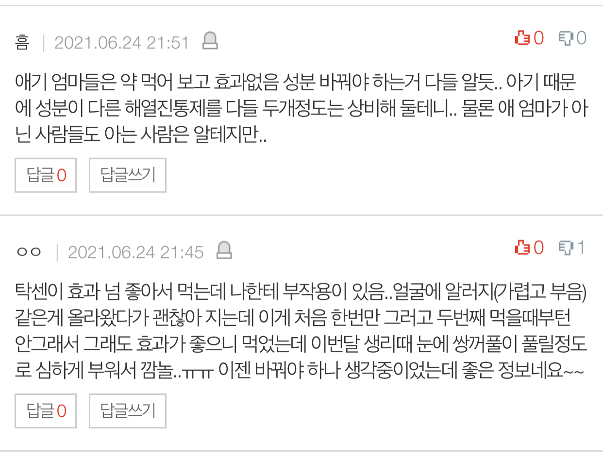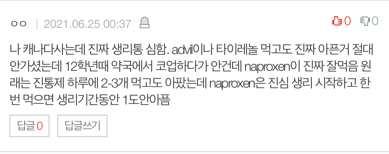 통증을 참으면서 소비하는 에너지랑, 약을 먹으면서 생길 수 있는 미약한 부작용을 비교하면.. 무조건 무조건 먹는 걸 권하는 편이죠. 그리고 생리통이 시작 됐을 때 말고, 생리 전 1~2일 전에 먹어야 해요.