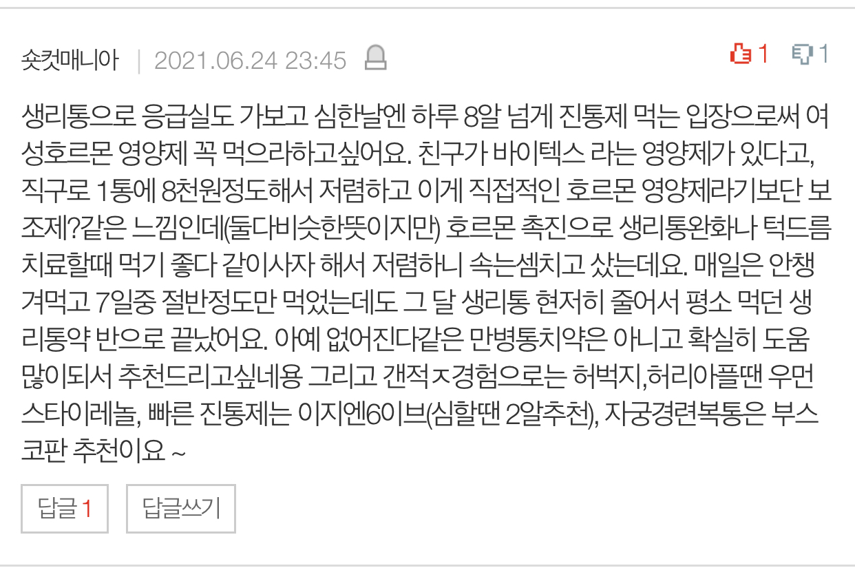 글이 길어졌네요. 어쨌든 생리통은 꼭 모든 고통을 감내해야 하는 건 아니니까 모두들 똑똑하게 이겨내셨으면 좋겠어요. 화이팅입니다!