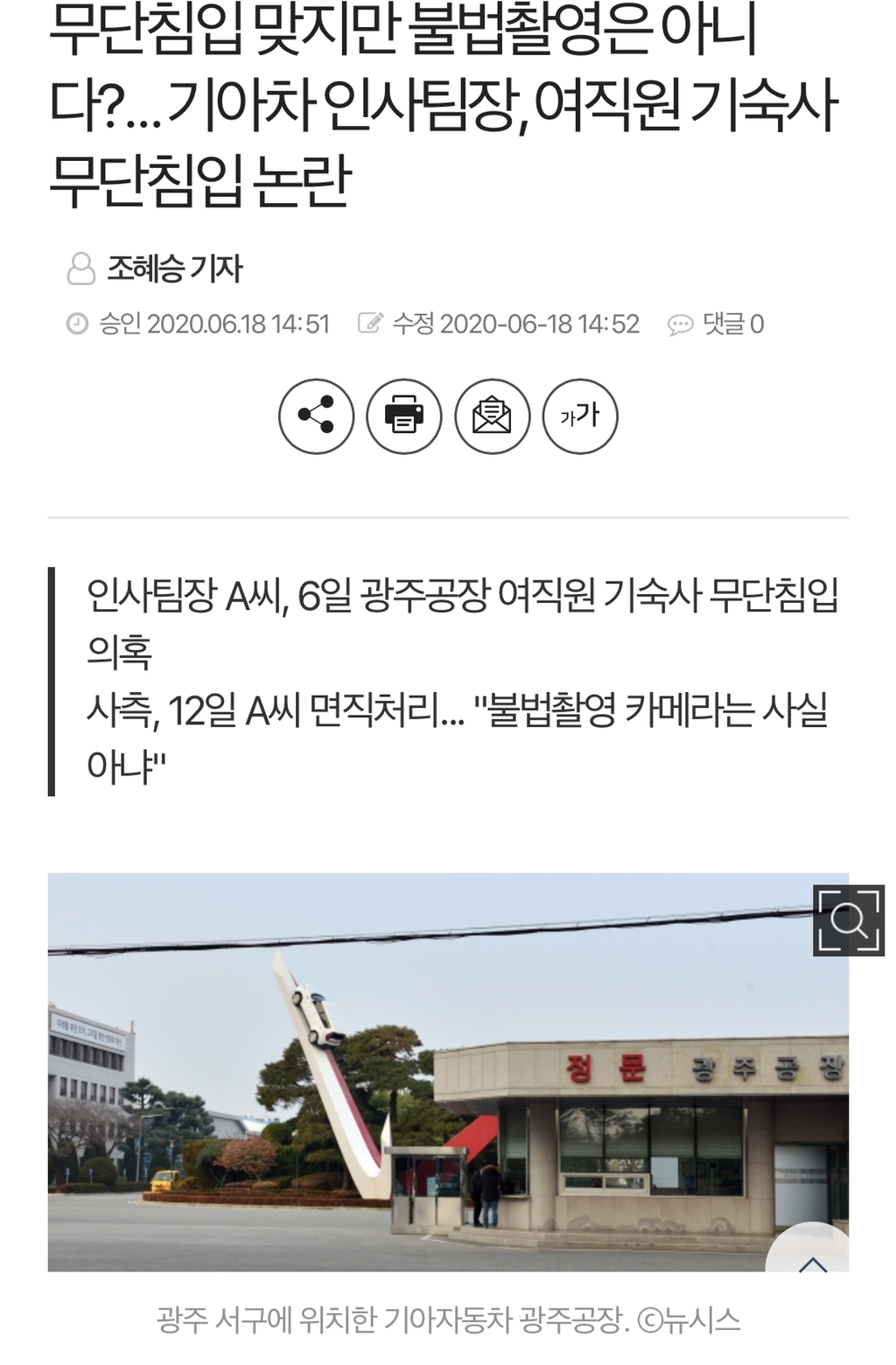 기아자동차 광주공장의 인사팀장이 여성직원 기숙사 방에 무단침입하고 불법촬영 카메라를 설치했다는 의혹이 제기됐다. 회사 측은 해당 직원이 기숙사 방에 무단으로 들어간 것은 맞지만, 불법촬영 카메라 설치는 사실이 아니라는 입장이다.
