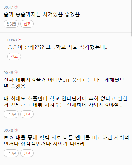 데뷔를 했다고 해도 학교 졸업이라도 한애 vs 그마저도 못한애는 좀 너무 차이나는거 같아