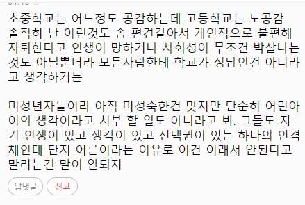 성인이 아니잖아 아이잖아 아이한테 원해서 선택하는거라고 말을 할 수 있나 성인들이 할 수 있는 판단 다른건 못하면서 자퇴만 무턱대고 허락해주면 어떡함