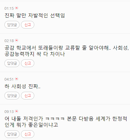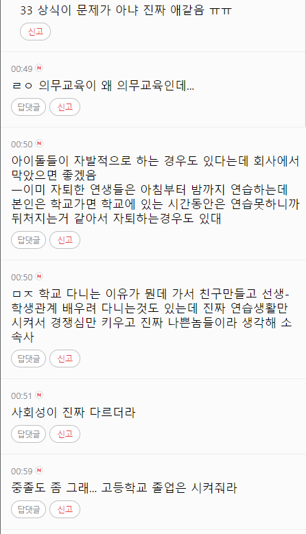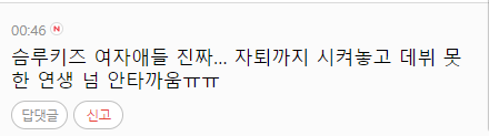 팬들도 넘 어린나이 데뷔만 바라지 말고 학교 자퇴하고서 데뷔하고 그래서 다른 친구 없고 이런거 좀 환영 안했으면 좋겠음...크리피해