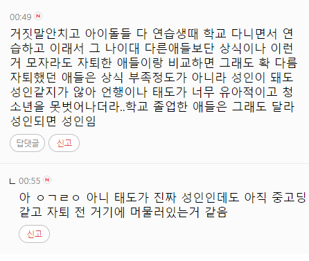 가뜩이나 아이돌들 덜자랑 미성숙한 자아 가득한데 학교 자퇴는 그걸 더 심화시키는거 같음
