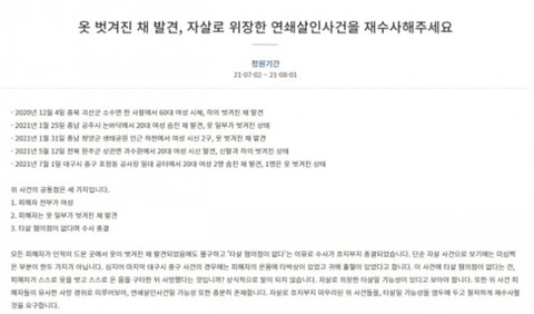 2일 청와대 국민청원 게시판엔 ‘옷 벗겨진 채 발견, 자살로 위장한 연쇄살인 사건을 재수사해주세요’라는 제목의 청원 글이 올라왔다. 청원인은 지난해부터 발생한 5건의 사건을 늘어놓으며 사건의 공통점 세 가지를 나열했다.
