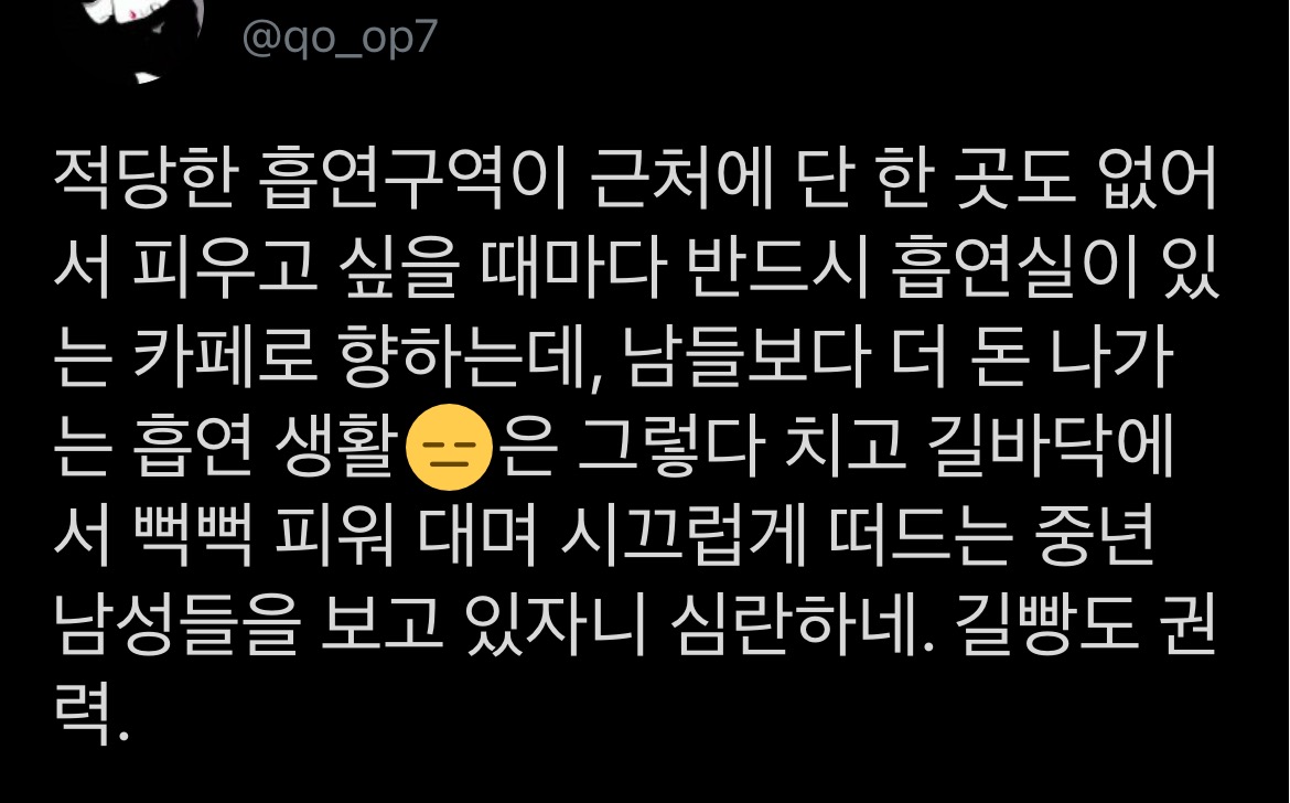 작성자자율주행 작성시간 21.07.05 개공감해. 요샌 길빵이 문화적으로 많이 위축돼서 덜 하지만 예전엔 흡연구역 가면 90퍼가 여자였음 왜? 남자들은 걍 아무데서나 피우면 되거든